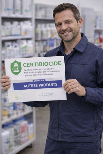 Le certibiocide « autres produits » est nécessaire pour les utilisateurs, les acquéreurs et les distributeurs des produits biocides réservés à l’usage professionnel appartenant aux types de produits suivants : TP8: produits de protection du bois TP15: produits avicides TP21: produits antisalissure Cette certification vise à certifier les personnes concernées par ces produits afin que celles-ci disposent d'un niveau de compétences suffisant et adapté permettant une utilisation raisonnée, durable et sûre de ces produits biocides pour, notamment, protéger l’environnement et les populations tierces exposées à ces produits via leur activité. Le certibiocide « autres produits » est nécessaire pour les utilisateurs, les acquéreurs et les distributeurs des produits biocides réservés à l’usage professionnel appartenant aux types de produits suivants : TP8: produits de protection du bois TP15: produits avicides TP21: produits antisalissure Cette certification vise à certifier les personnes concernées par ces produits afin que celles-ci disposent d'un niveau de compétences suffisant et adapté permettant une utilisation raisonnée, durable et sûre de ces produits biocides pour, notamment, protéger l’environnement et les populations tierces exposées à ces produits via leur activité. |