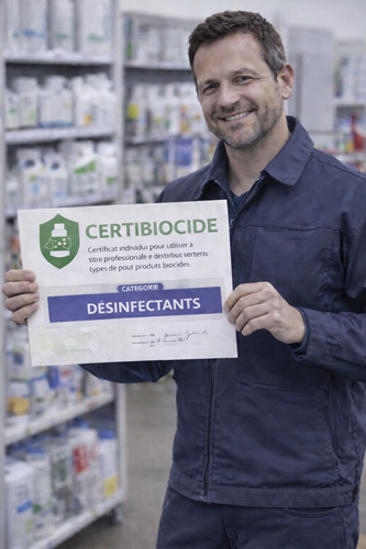 La catégorie "désinfectants" concerne les décideurs, les acquéreurs et les distributeurs de produits désinfectants (TP2, TP3 et TP4) réservés à l’usage professionnel. Cette certification vise à certifier les personnes concernées par ces produits afin que celles-ci disposent d'un niveau de compétences suffisant et adapté permettant une utilisation raisonnée, durable et sûre de ces produits biocides pour, notamment, protéger l’environnement et les populations tierces exposées à ces produits via leur activité. |